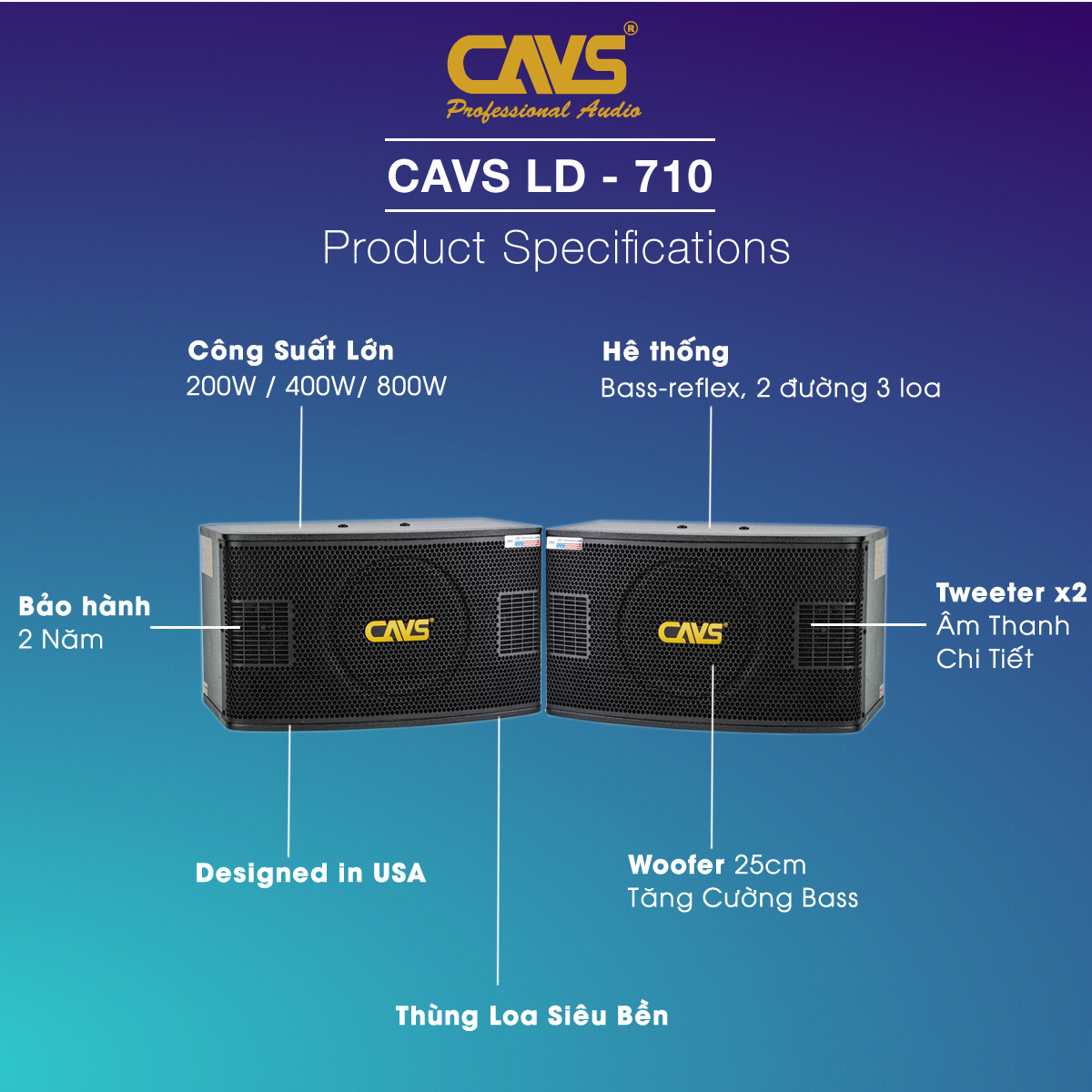 Loa karaoke CAVS LD 710 sử dụng công nghệ phản chiếu cao cấp, được thiết kế đặc biệt cho hát karaoke gia đình cũng như nghe nhạc cho các phòng Bar, cửa hàng Caffe, các hội trường lớn. Được thiết kế và nghiên cứu chắt lọc những gì tinh túy nhất nên các dãi tần của loa được quan tâm nhiều nhất khiển cho loa có chất âm êm, trong trẻo nhưng không kém phần bay bổng