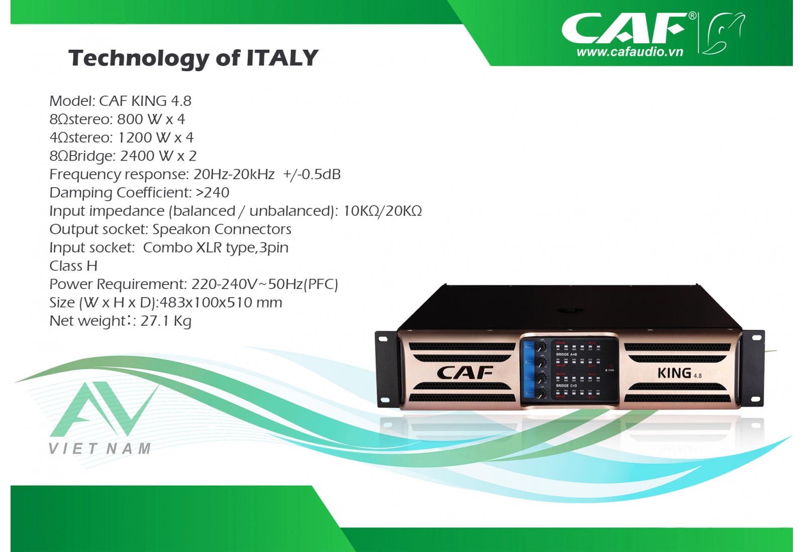 Cục công suất CAF KING 4.8 là một trong những cục công suất thuộc phân khúc chuyên nghiệp với thiết kế hiện đại, sang trọng, CAF KING 4.8 là sự lựa chọn số 1 của chủ đầu tư các dự án lớn, bởi sự ổn định và chất âm trong sáng, chi tiết. Sản phẩm đã lắp đặt và sử dụng tại nhiều dự án lớn như Karaoke VICTORY HCM (32 phòng), Karaoke PHƯƠNG ANH (21 phòng) , và rất nhiều các dự án khácn trên toàn quốc.
